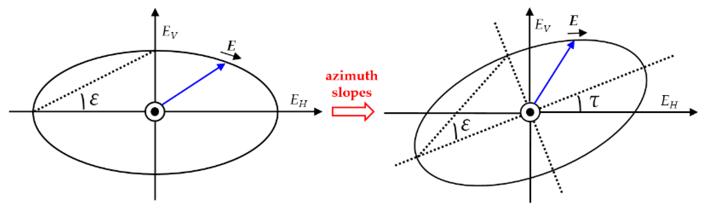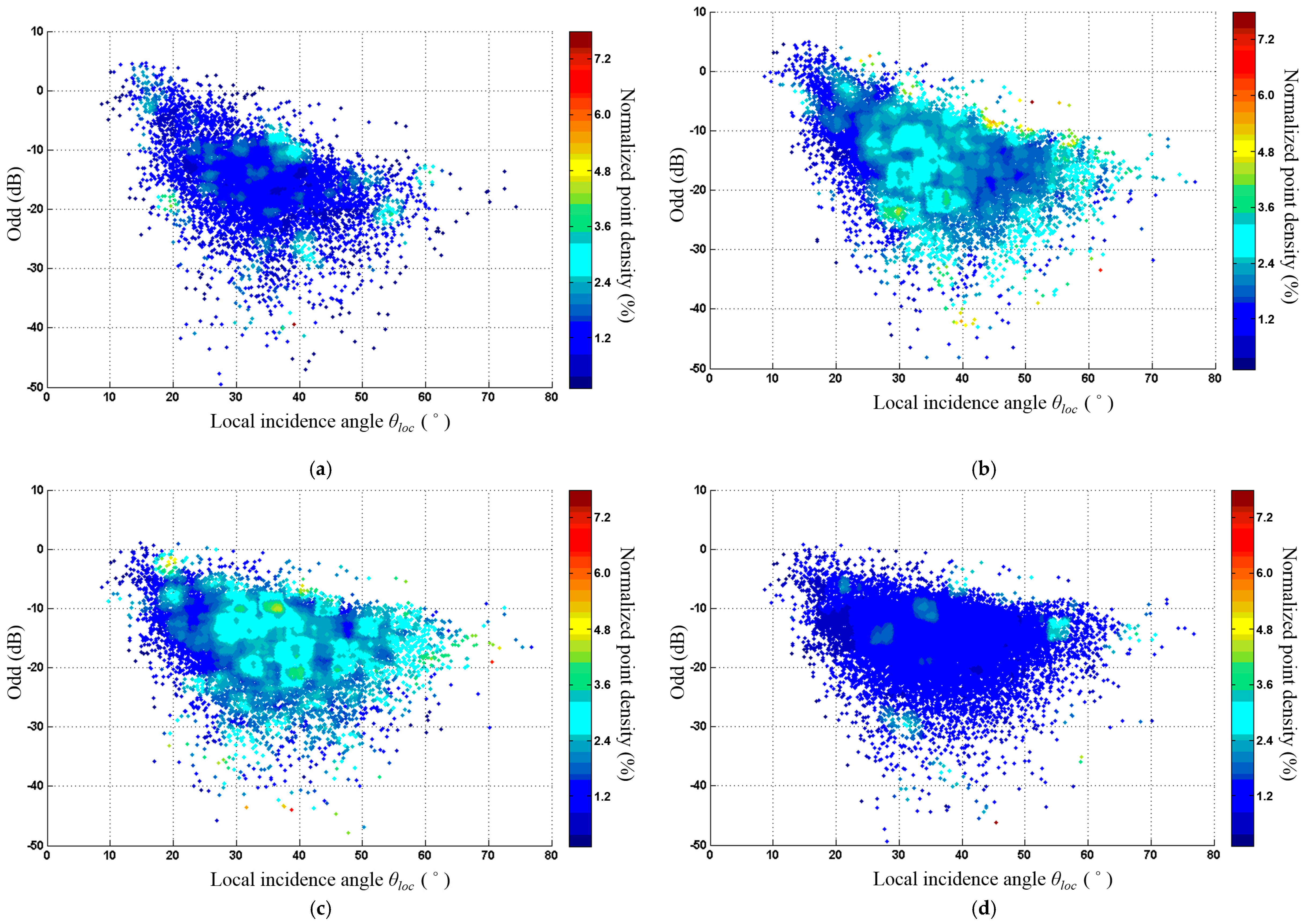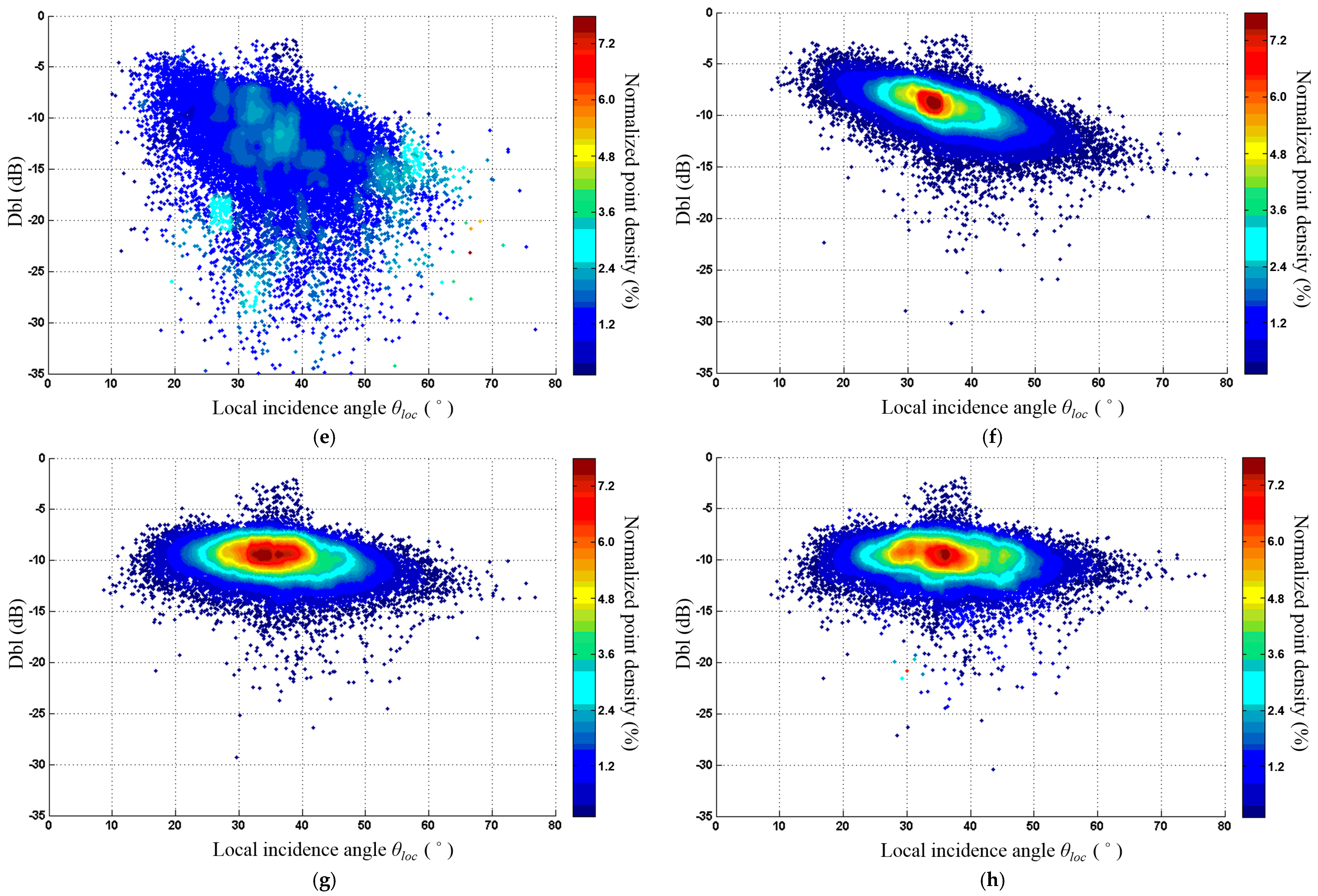 Figure 17d). Additionally, the POA shift exerted more influence on HV polarisation than HH and VV. For example, when the POA shifted by approximately 20°, the maximum biases of HH and VV polarisation were approximately 0.5 dB, while that of HV polarisation was greater than 1 dB. This also indicates that POA correction is an indispensable step for terrain correction of PolSAR data. These different behaviours can be explained by the physical basis of the POA shift. When polarimetric radar images a horizontal surface, the horizontal polarisation electric field of transmitted and received data is parallel to the surface. For a tilted surface, however, the horizontal electric field of transmitted data is no longer parallel to the horizontal surface. However, the horizontal electric field of received data is parallel to the tilted surface. Therefore, there is a shift in angle between the transmitted and received electromagnetic wave vectors. Consequently, the horizontal-transmitting and vertical-receiving (HV) components are increased and horizontal-transmitting and horizontal-receiving (HH) components are decreased, due to the tilted slope. In the case of a vertical polarisation wave, a similar phenomenon occurs. Therefore, the basic rule is that cross-polarisation (HV) will be overestimated and co-polarisation (HH + VV) will be underestimated due to the POA angle shift.
