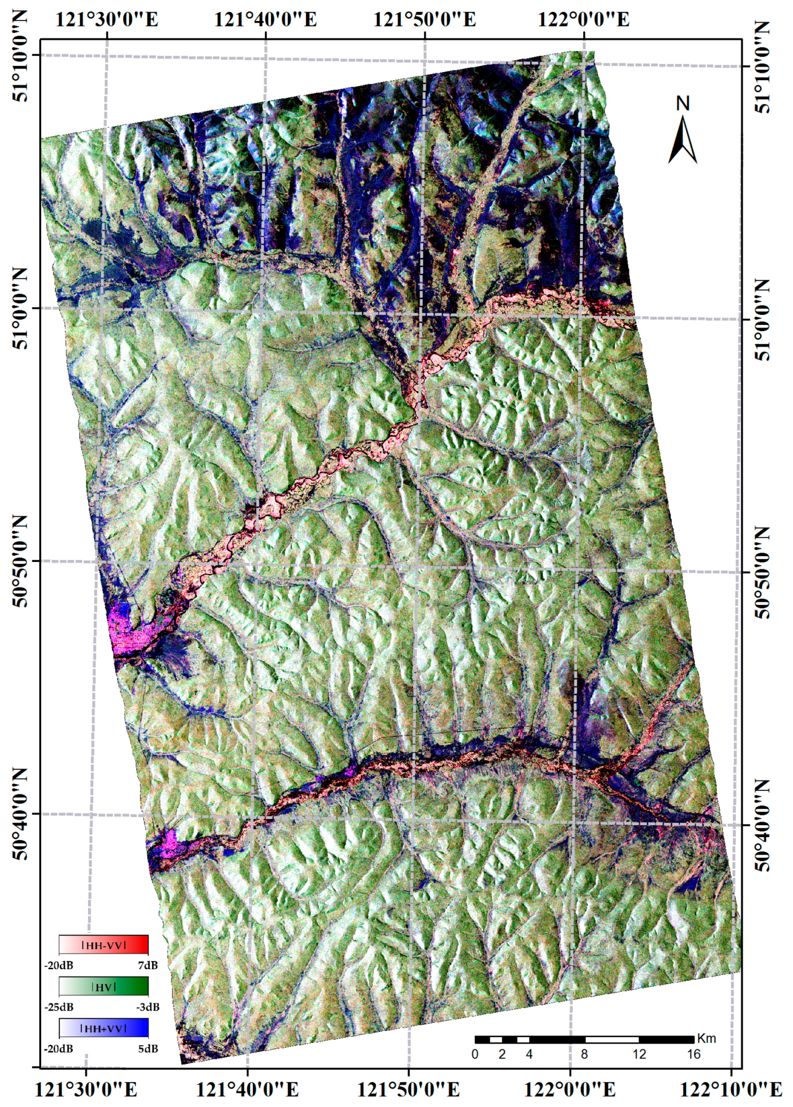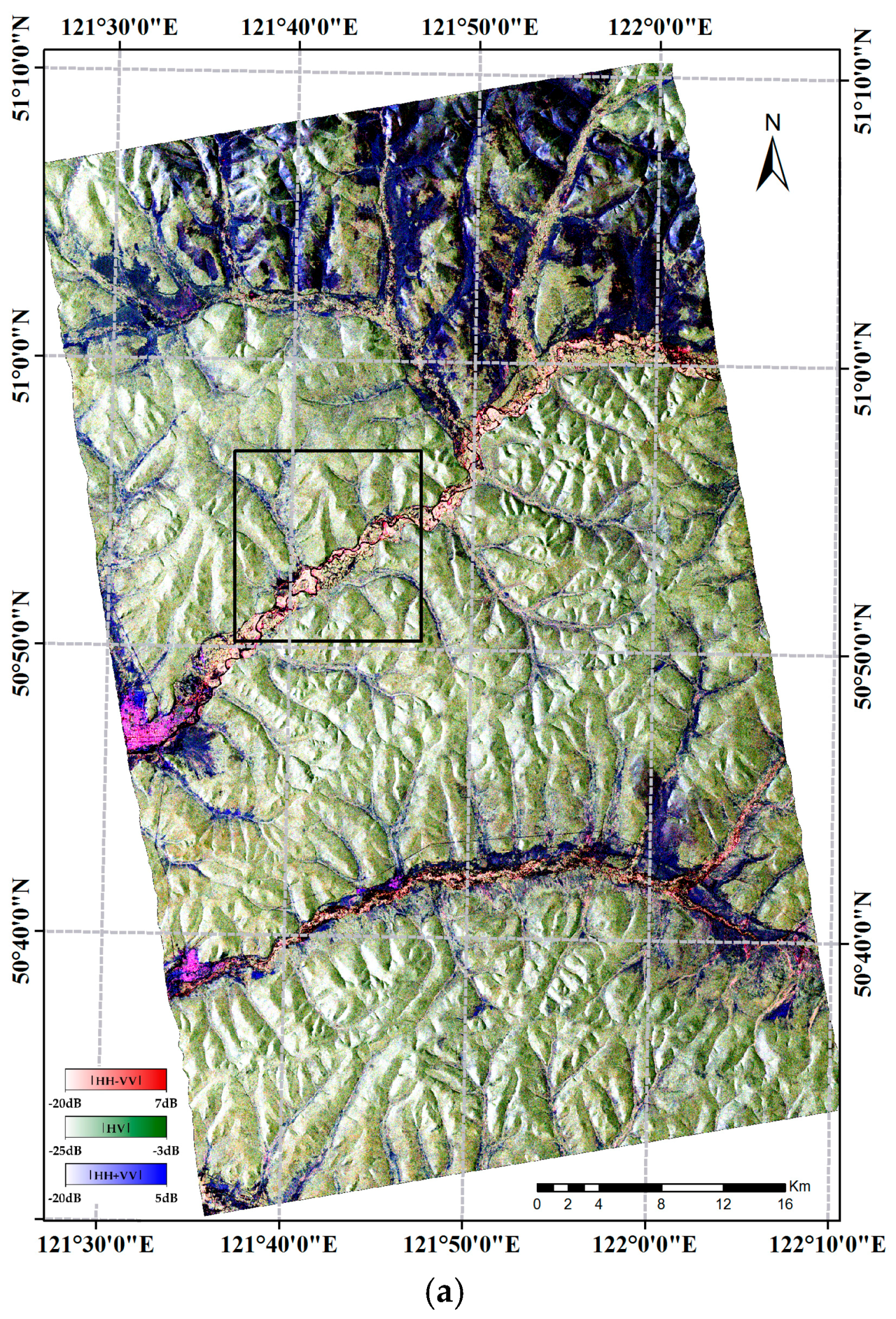 Figure 15a presents the Pauli RGB image of PolSAR data after POA correction. Compared to the uncorrected case (
