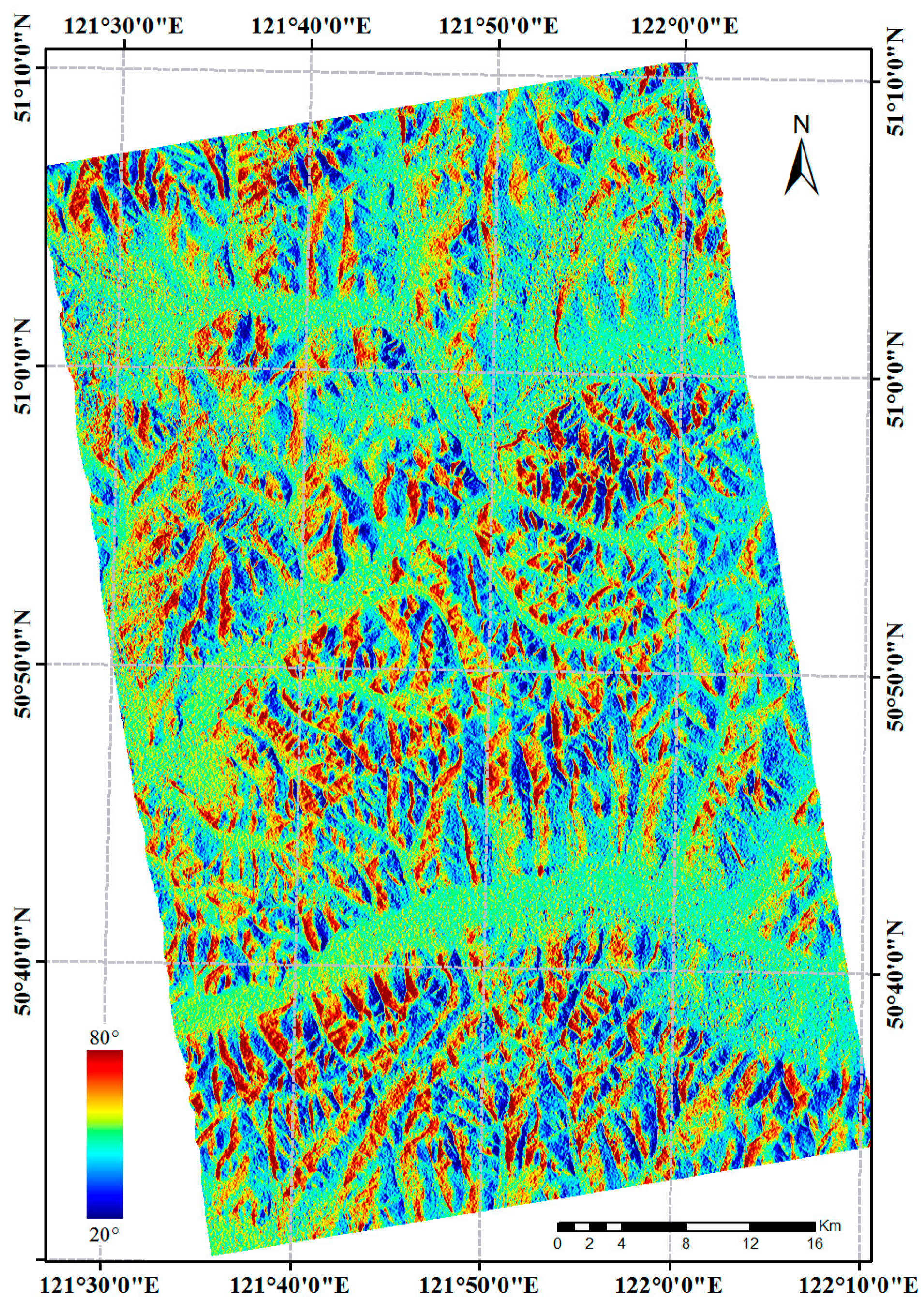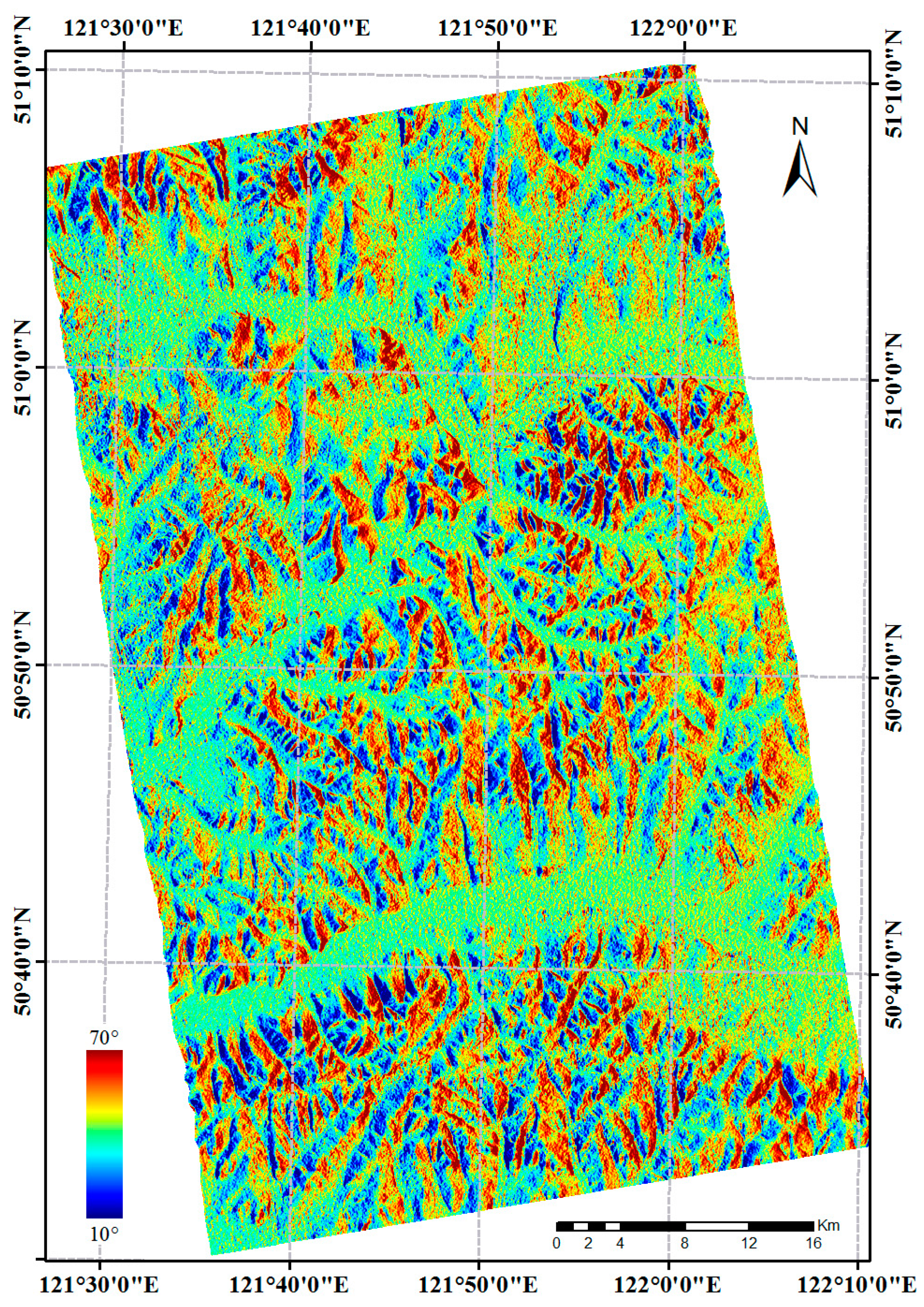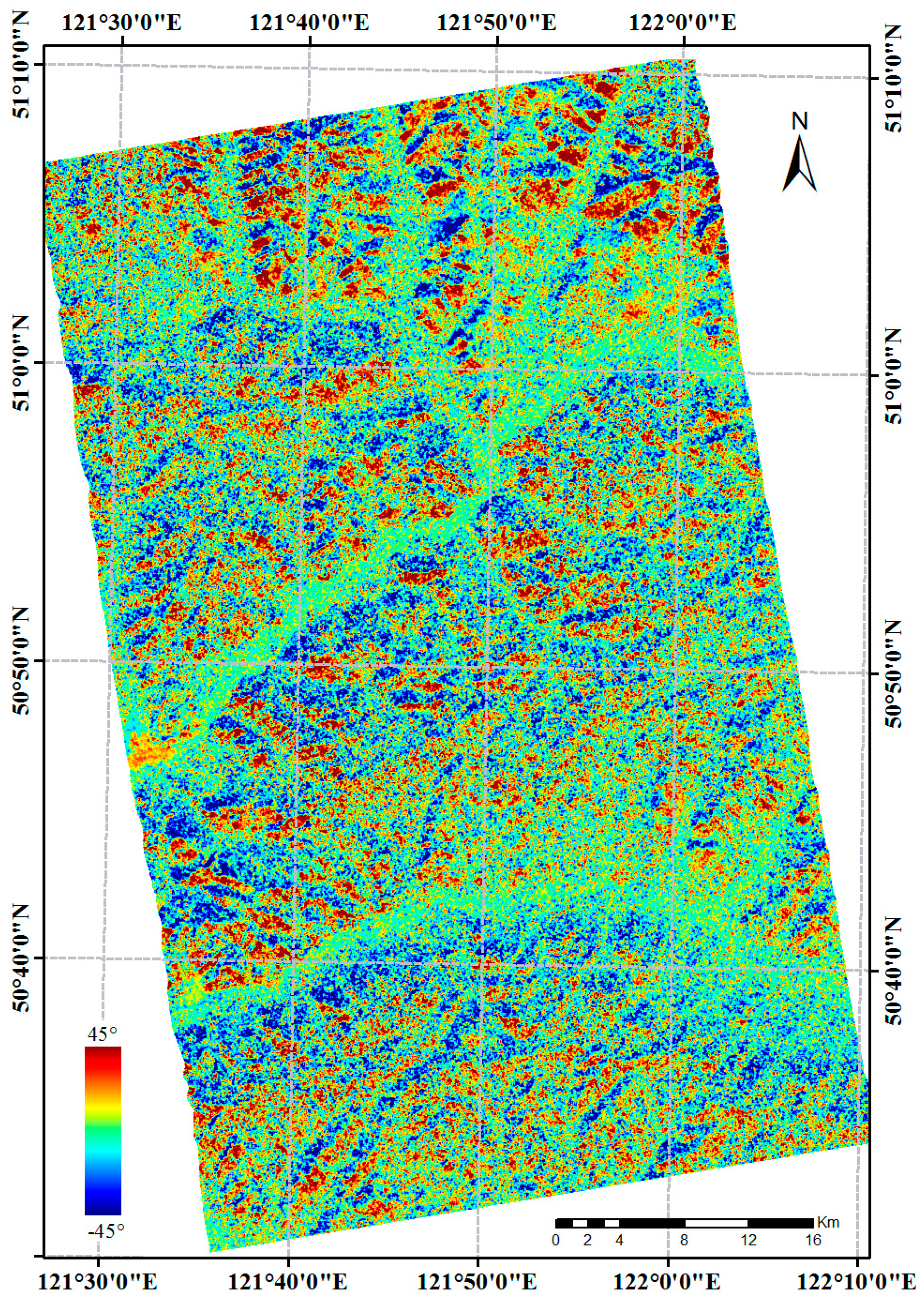 Figure 9), there appears to be no significant difference. This is because visual terrain effects on PolSAR image results are mainly due to the difference between front and back slopes in the range direction. In contrast, the impact of azimuth terrain is relatively weak in the case of an entire scene PolSAR image. Thus, there are no obvious visual changes after POA correction.