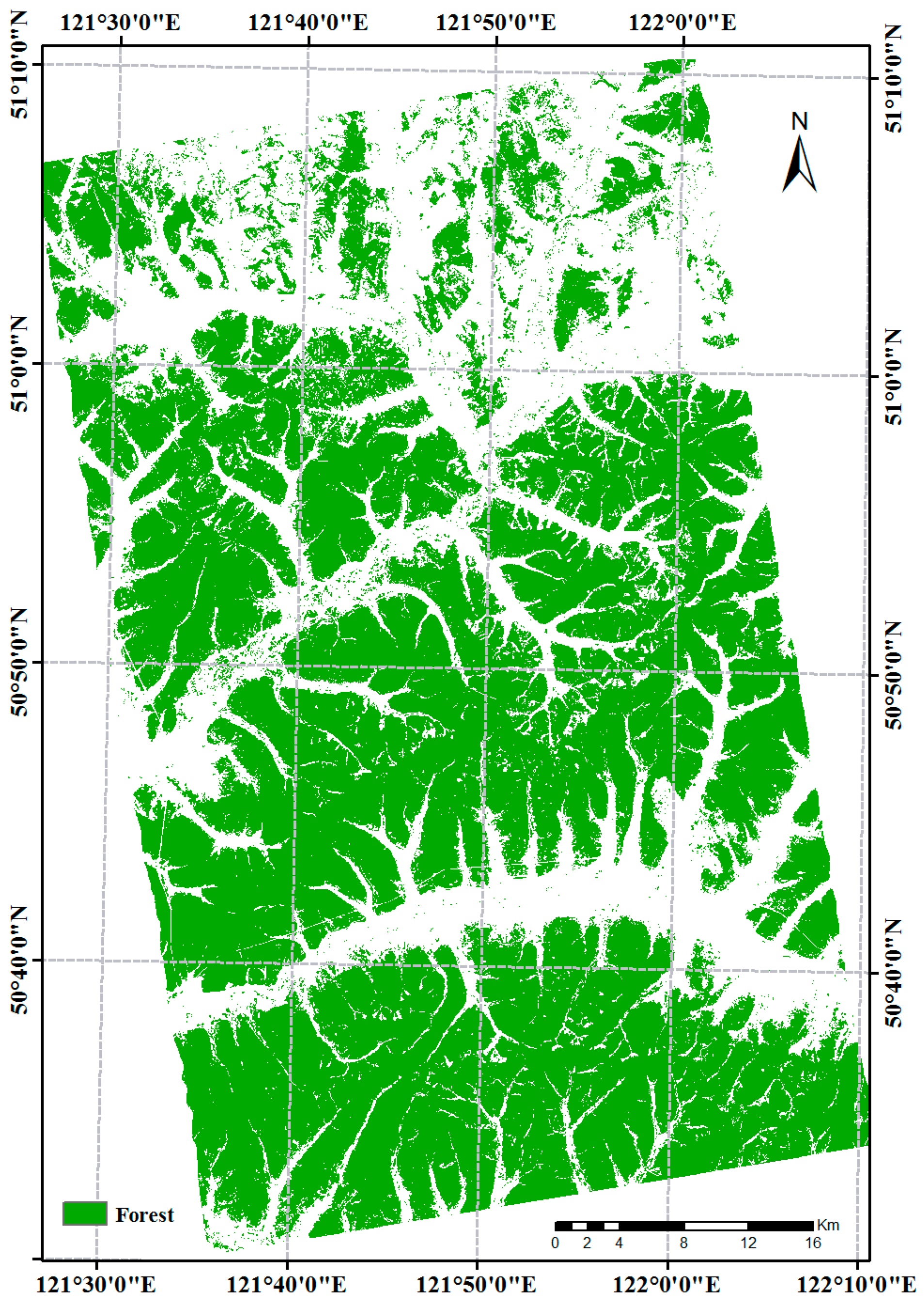 Figure 8). Based on the PolSAR data following POA and ESA corrections, the forest cover map (