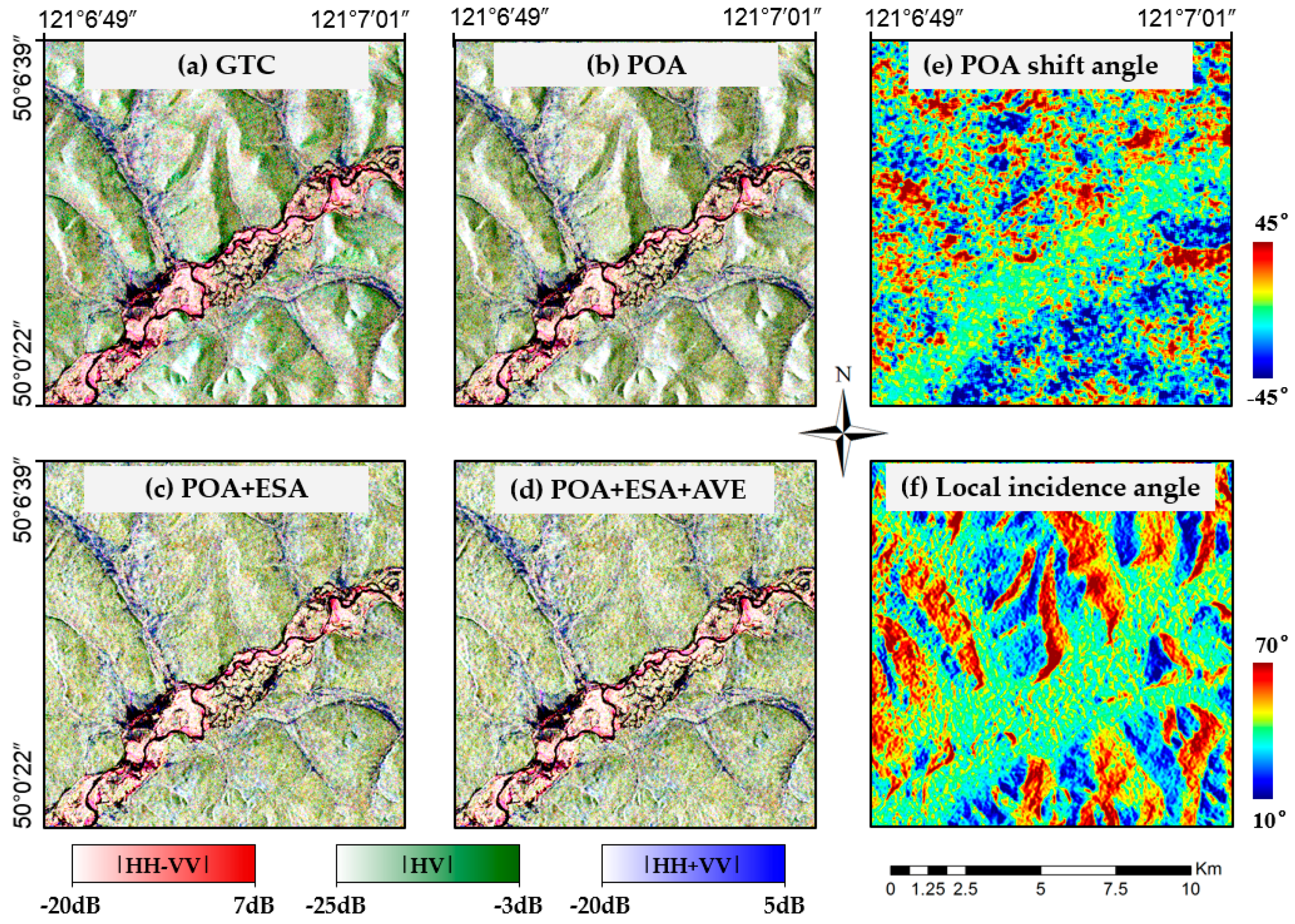 The PolSAR image terrain correction includes three steps: POA, ESA, and AVE corrections. Among these, POA correction can be completed in the slant-range space of PolSAR images before the geocoding process. The two remaining correction processes can be completed in geographic space with the GTC model. For convenient comparison, we present all of our results in geographic coordinate space.