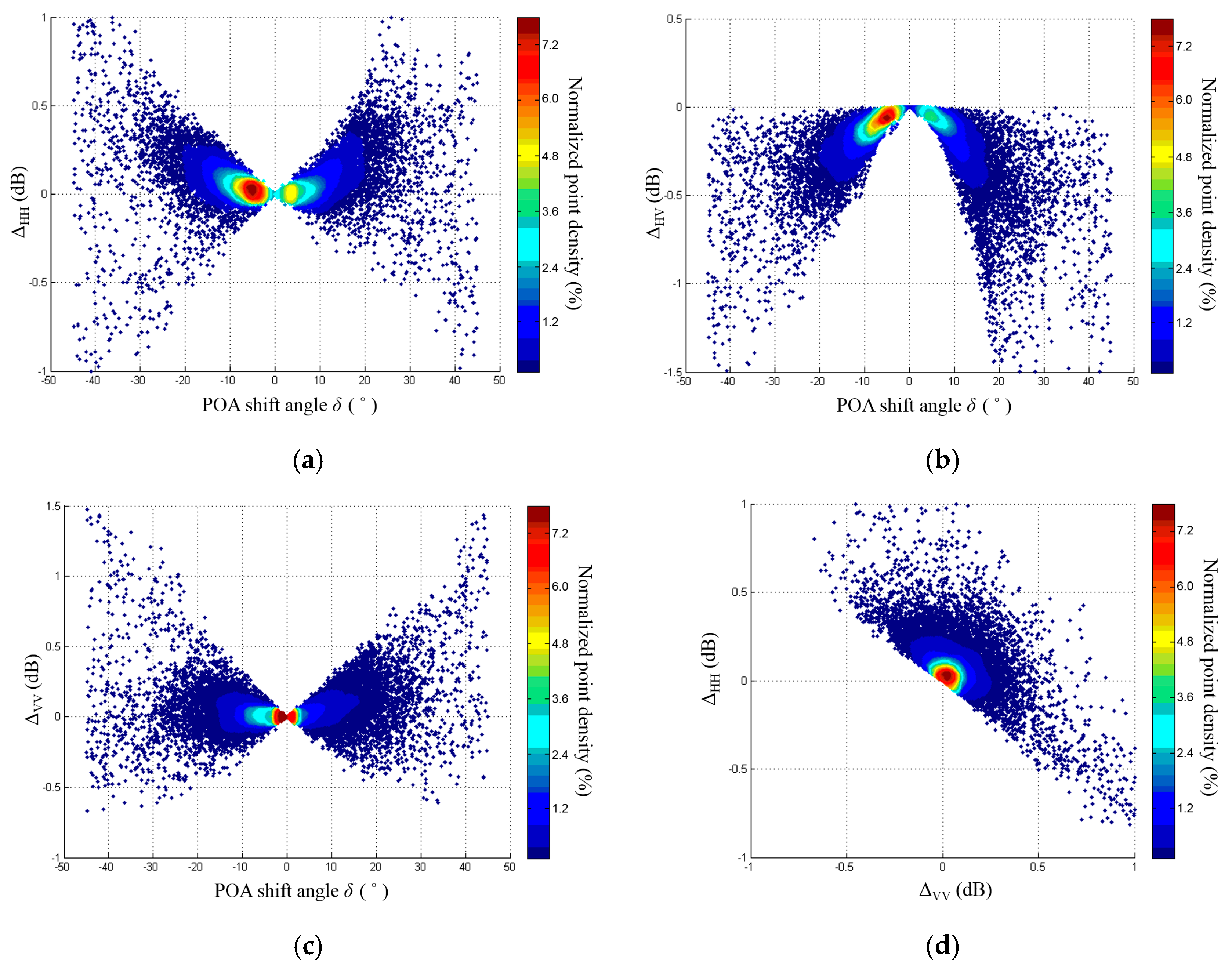 HV may only be less than zero. These patterns indicate that a POA shift will cause overestimation of the backscattering coefficient of HV polarisation. Because of the conservation of polarimetric span, HH and VV polarisation cannot be overestimated simultaneously; that is, Δ