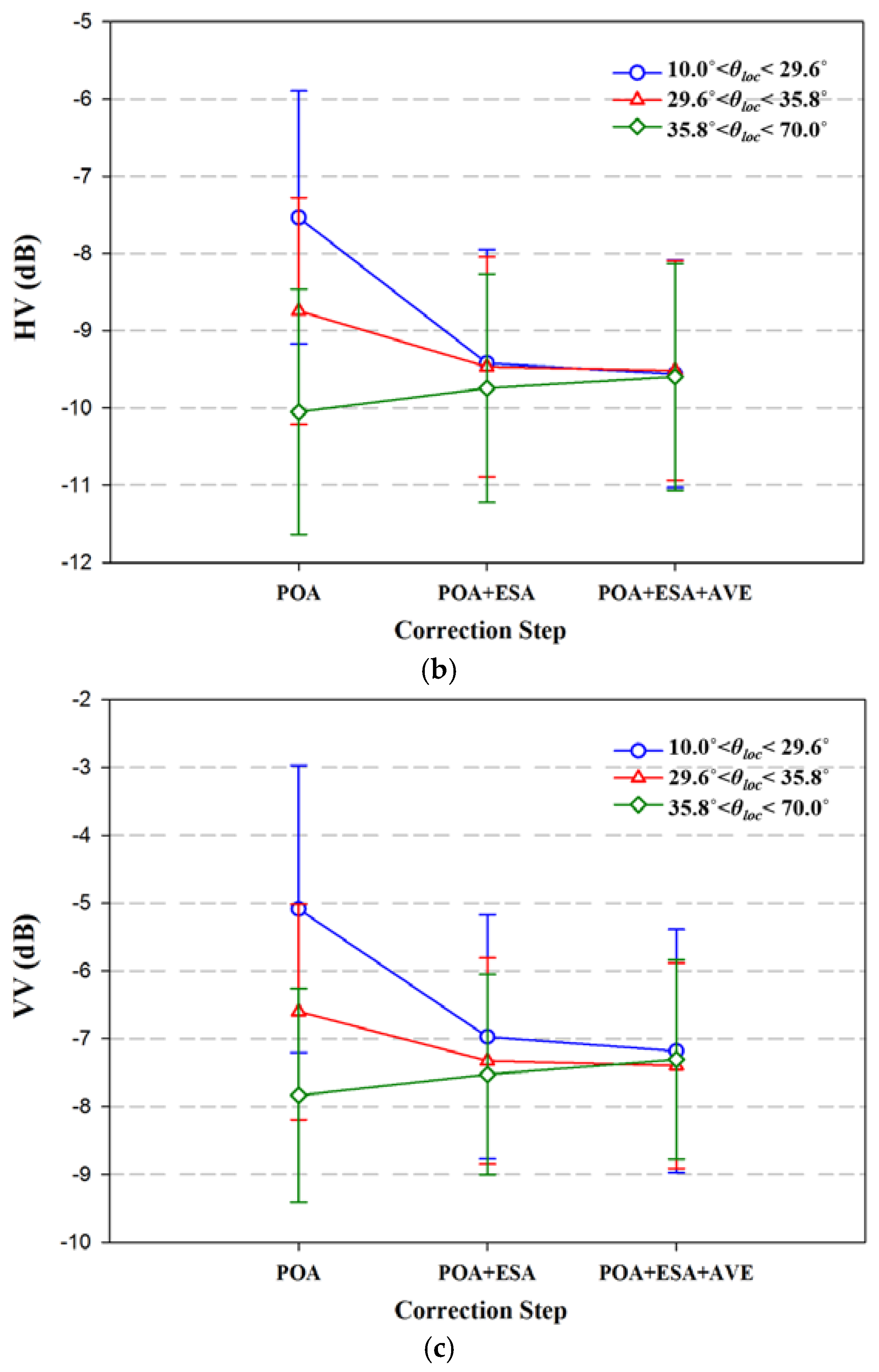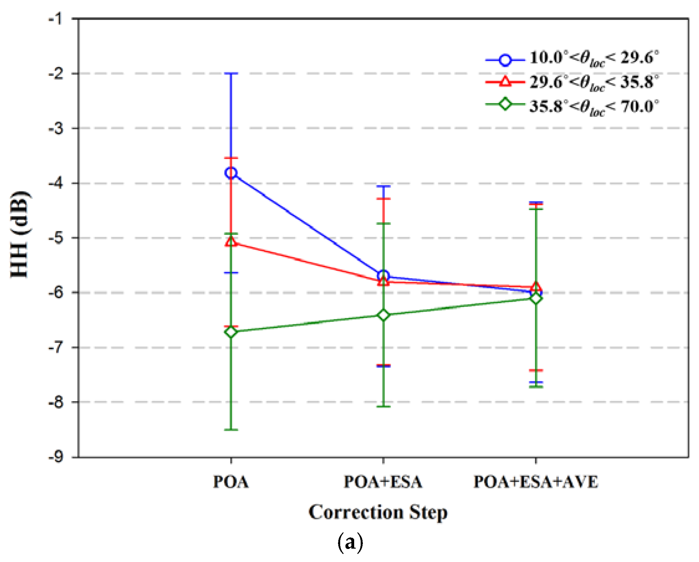 VV were the differences between the corrected and uncorrected backscattering coefficients for different polarisations (corrected − uncorrected pixel values). With increasing POA shift angle, the numerical ranges of Δ