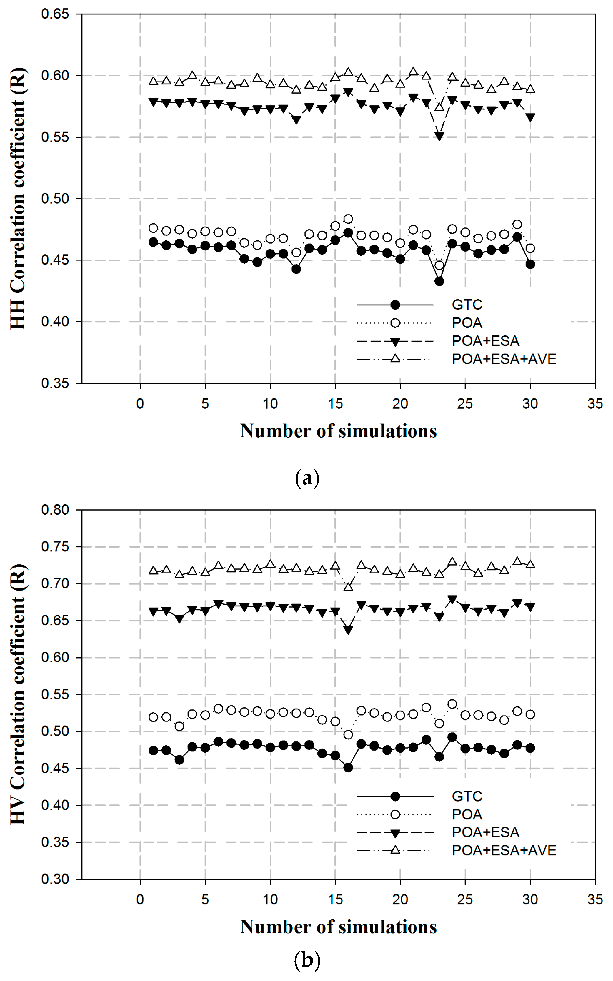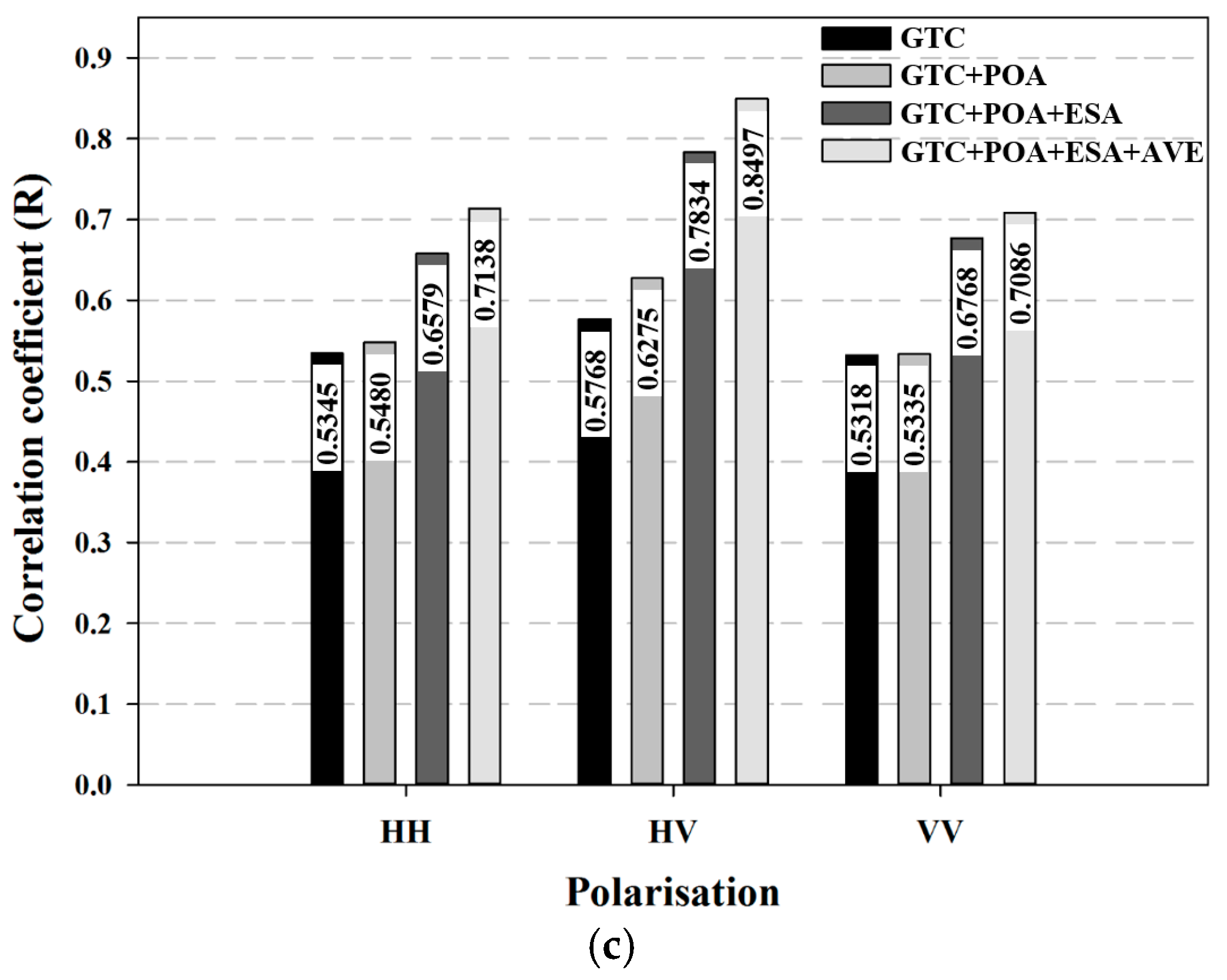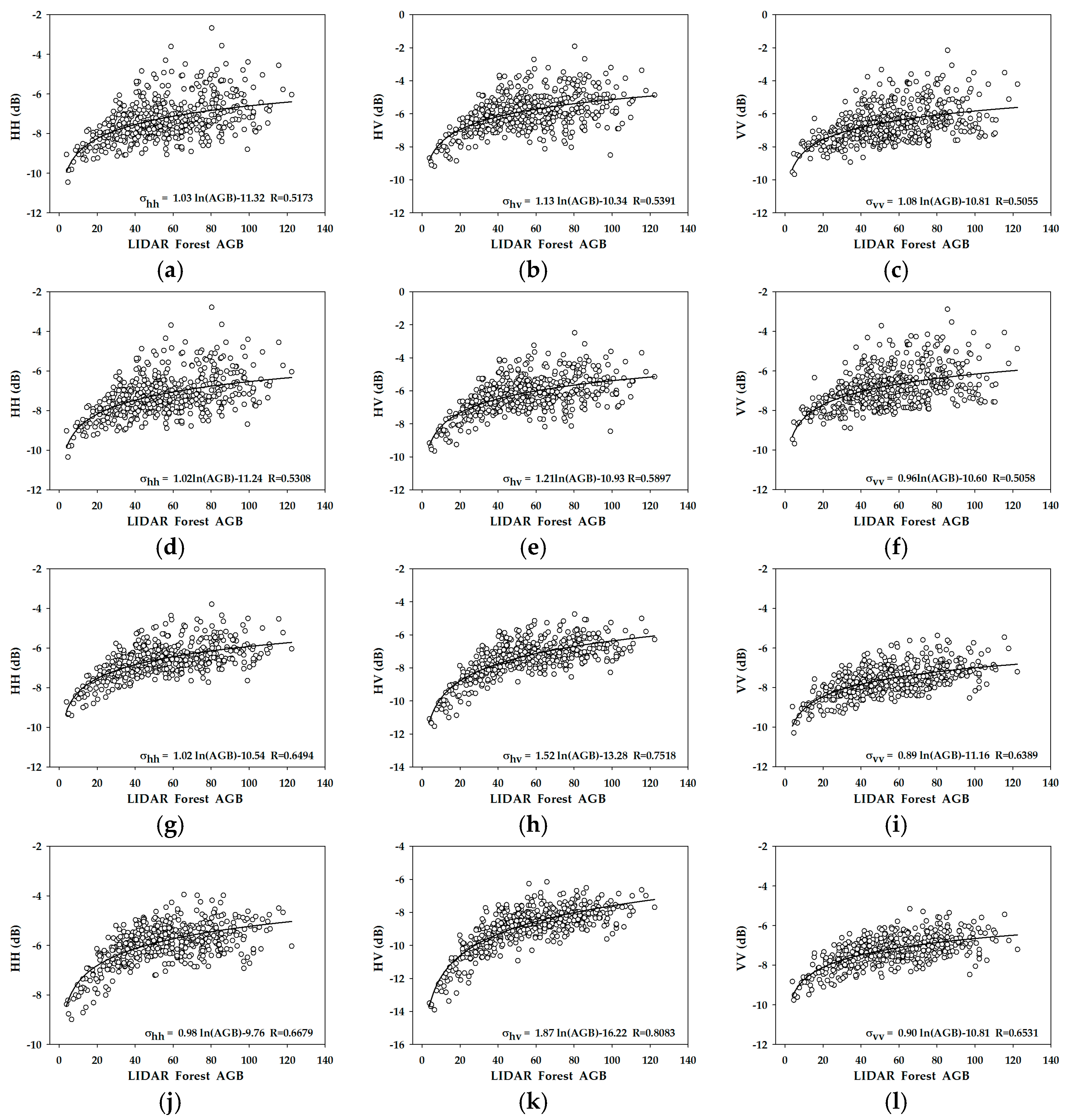 Figure 21d–l shows the same result after processing at each correction step. This shows that three-step RTC can significantly reduce the dispersion of the points. All of the correlations between the backscattering coefficients of each of the three polarisations and the forest AGB were improved; the lowest R value in the POA + ESA + AVE correction step (