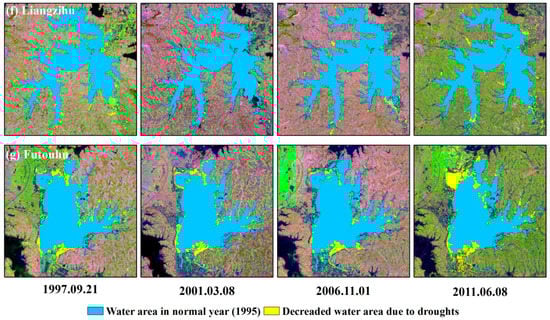 These two non-urban lakes showed a significant correlation (p-values < 0.05). For Futouhu and Liangzihu, their r-values in area were 0.6771 and 0.6558, respectively. Overall, the lake-water areas of the entire study area showed a significant correlation with precipitation. It is evident from Figure 9 that much rainfall in the study area in 1996, 1998, 2002, and 2010 resulted in floods, which increased the lake-water area (Figure 10), while little rainfall in the study area in 1997, 2001, 2006, and 2011 decreased the lake-water area (Figure 11), because of droughts. From 1999–2001 and from 2002–2006, rainfall in the study area continuously decreased, resulting in a continuous decrease in the lake-water area, whereas, from 2007–2010, rainfall in the study area increased, resulting in an increase in the lake-water area. Moreover, for Futouhu, we found that relatively regular enclosure nets are distributed in Lake Futohu from Figure 5, indicating the influence of human activities. Therefore, the stable and increased extent of Lake Futouhu from 2004 to 2006, while the precipitation was decreasing, is possible.