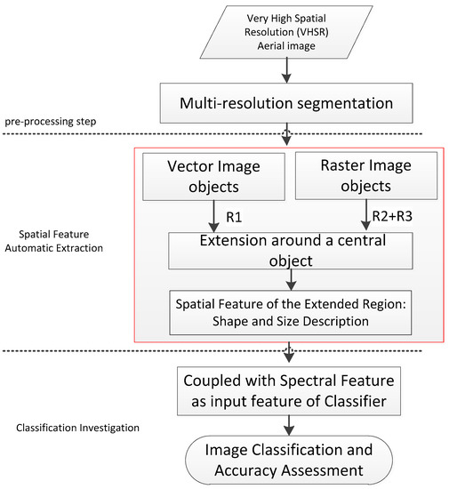 Aerial image classification has become popular and has attracted extensive research efforts in recent decades. The main challenge lies in its very high spatial resolution but relatively insufficient spectral information. To this end, spatial-spectral feature extraction is a popular strategy for classification. However, parameter determination for that feature extraction is usually time-consuming and depends excessively on experience. In this paper, an automatic spatial feature extraction approach based on image raster and segmental vector data cross-analysis is proposed for the classification of very high spatial resolution (VHSR) aerial imagery. First, multi-resolution segmentation is used to generate strongly homogeneous image objects and extract corresponding vectors. Then, to automatically explore the region of a ground target, two rules, which are derived from Tobler’s First Law of Geography (TFL) and a topological relationship of vector data, are integrated to constrain the extension of a region around a central object. Third, the shape and size of the extended region are described. A final classification map is achieved through a supervised classifier using shape, size, and spectral features. Experiments on three real aerial images of VHSR (0.1 to 0.32 m) are done to evaluate effectiveness and robustness of the proposed approach. Comparisons to state-of-the-art methods demonstrate the superiority of the proposed method in VHSR image classification.