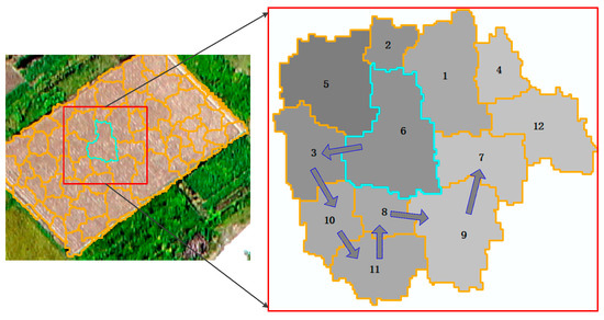 It should be noted that: (i) In each iteration, is replaced only for the extension in the spatial domain. The initial attribute of , including its mean and standard deviation, are not varied in step-3 and the constraint rule (R2 and R3); (ii) according to TLF of geography, an object within the surrounding object set that achieves the nearest distance between itself and its central object is selected as the next central object for iteration, and distances are determined by (3). This is to ensure that the explored objects produce features similar to the central object in the attribute (feature) domain, but extend one by one in the spatial domain. As an example, in Figure 3, is highlighted as the central object, and it is readily seen that the region of a target soil can be extracted object-by-object using our proposed algorithm.