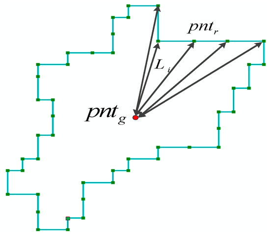 where is distance between the gravity point () and region boundary point , n is the total number of points on the region boundary, and n is determined by the interval distance and boundary length, as shown in Figure 4.