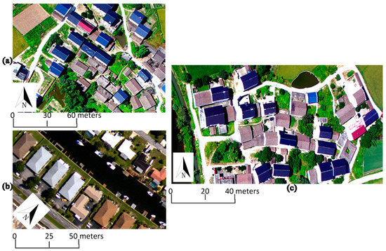 Experiment very high spatial resolution (VHSR) images: (a) Unmanned aerial vehicle (UAV) image for experiment-1; (b) aerial image for experiment-2; (c) UAV image for experiment-3.