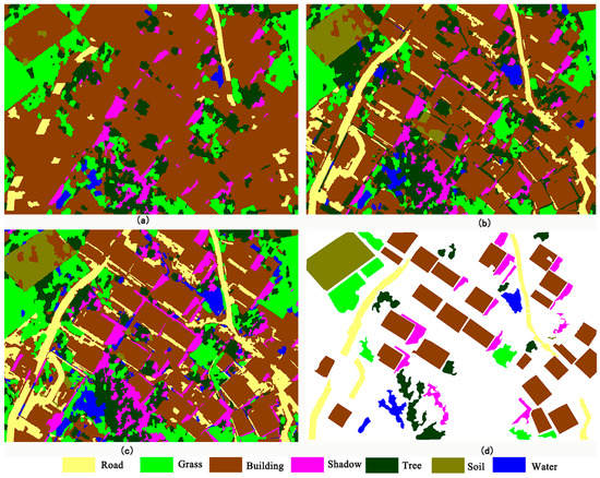 The third image (Figure 5c) was acquired in the same way as the first. The image is 1807 × 792 pixels and is of a typical urbanized area in China. It includes seven classes, i.e., roads, grass, buildings, shadow, trees, soil and water.