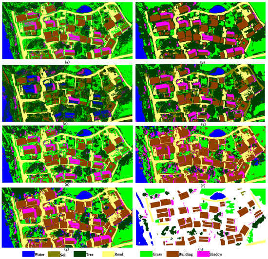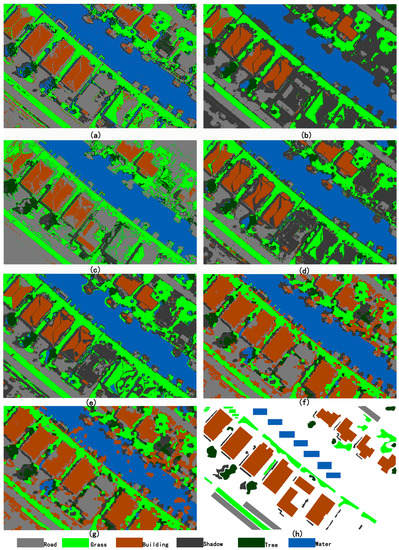 In the first experiment, to test the adaptive ability of our method for different classifiers, an aerial image was obtained from a UAV platform and Canon EOS 5D Mark II camera. Flight elevation was ~100 m and spatial resolution ~0.1 m. This image is 1400 × 1000 pixels. As shown in Figure 5a, seven classes were identified in the scene, i.e., roads, grass, buildings, shadow, trees, soil, and water.
