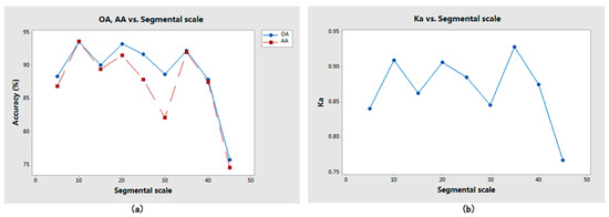 Figure 9. Relationship between segmental scale and accuracy: (a) OA, AA vs. segmental scale; (b) Ka vs. segmental scale. - (ii)