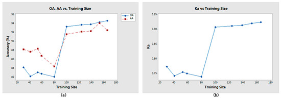 Figure 10. Relationship between the training size and accuracy: (a) OA, AA vs. training size; (b) Ka vs. training size.