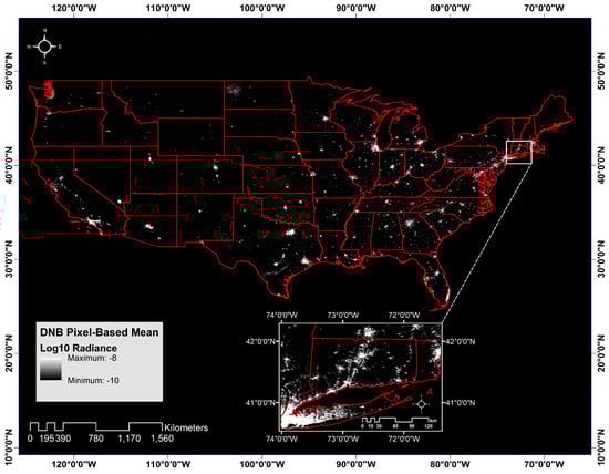Mean pixel radiance for highest quality observations from 19 January 2012 through 31 December 2015. Imagery represents the base-10 logarithm of the mean radiance value (nW·cm−2·sr−1), scaled to an 8-bit grayscale image from −10 to −8. The white inset box shows the distribution of nighttime lights (NTL) in the Mid-Atlantic and New England regions.
