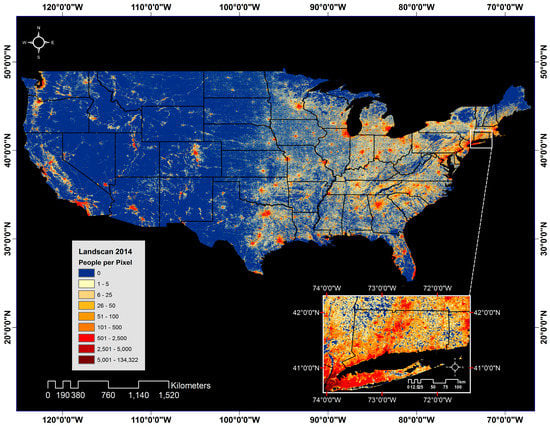As a reference layer for the comparison of DNB emissions to reported power outages, we used the 2014 global Landscan population dataset produced by ORNL (Figure 2). This product is a 1 km raster image that estimates ambient (daily average) population on a latitude/longitude grid, which matches the DNB imagery. Each pixel is assigned an integer population count. Acknowledging the frequent movement of humans on a daily, weekly, and annual scale, the intent of Landscan is to provide a model of all human movement and not just permanent settlements [], which makes it useful for outage prediction models. Empirically, we have found that many utilities tend to update and maintain the electric grid to benefit the largest number of customers possible; therefore, the Landscan population data may also provide implicit detail on attributes of the grid that we have not modeled directly (i.e., age of poles or equipment).