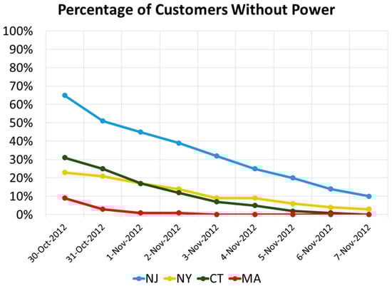 Timeline of the percentage of customers without power following Hurricane Sandy. Produced using emergency situation reports provided by the U.S. Department of Energy, Office of Electricity Delivery and Energy Reliability from 30 October to 7 November [].