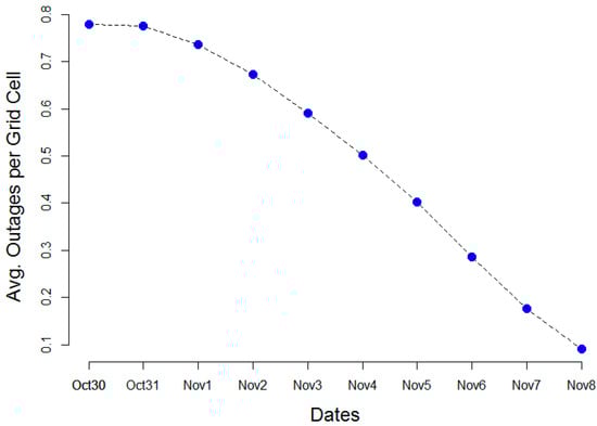 The outage data used here covers 20,195 1 km grid cells across a study area that includes the majority of Connecticut and parts of western Massachusetts. Over 400,000 isolating devices are maintained by Eversource across 5900 square miles of service territory in Connecticut and western Massachuessetts. The average number of outages per grid cell per day in Figure 5 shows a decreasing trend, demonstrating how outages were repaired by line crews each day following the storm, comparable to overall statewide trends previously shown in Figure 4.