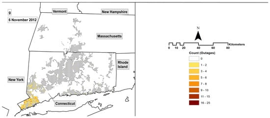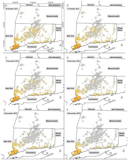 Evolution of reported power outages for each post-event night, mapped to the fishnet grid, and limited to MSA areas. Each panel corresponds to (a) 30 October, (b) 31 October, (c) 1 November, (d) 2 November, (e) 3 November, (f) 4 November, and (g) 6 November 2012. Areas in white are excluded from our analysis. These areas represent the United Illuminating service territory, other municipal electricity cooperatives, and areas that do not contain an isolating device or are not included in the MSA rural/urban shapefile. Areas in grey are grid cells with no reported outages for that post-event night. Each panel covers the same geographic region and spatial extent.