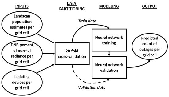 With regard to disaster response efforts, artificial nighttime light (NTL) emissions are of interest because they provide an indication of human activity patterns. Across the landscape, these emissions originate from residential single- or multi-family homes, local businesses, airports, factories and refineries, stadiums, government buildings and other facilities—in essence, a wide-range of different urban land uses. Disruptions to these light-emitting features can be observed and monitored in DNB data as darkened or unlit pixels in locations where urban infrastructure (i.e., lit pixels) are expected during normal conditions. To assist response efforts, semi-automated, near-real-time detections of light reductions or outages from the VIIRS DNB can be generated following disaster events that result in interruptions to electrical power delivery. This dataset, available on a daily basis for cloud-free portions of the entire globe, can be combined with locally-relevant geospatial information to predict outages. Such a retrieval strategy can be particularly useful for multi-day disaster events with widespread outages that can be mapped during multiple Suomi-NPP overpasses. In these scenarios, DNB-based power outage estimates can help provide insights into the timing and duration of initial loss of light emissions, in addition to the rate of light recovery as response efforts return electrical power to outage-affected areas. In this context, the aim of this study is to generate a power outage detection product based on the Suomi-NPP VIIRS DNB. This product is then used as input to a layered, feedforward neural network model that employs a synergistic combination of daily, corrected nighttime observations with electrical infrastructure and ambient population estimates to perform power outage predictions.