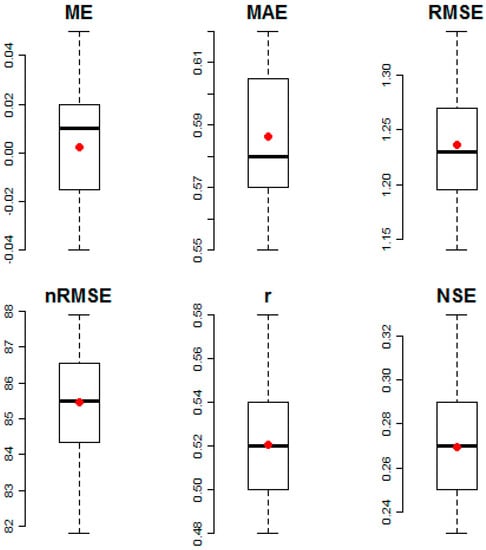 We evaluated results from the outage prediction model in terms of their magnitude and spatial accuracy because these metrics correspond with a utility’s emergency preparedness actions to secure and pre-stage mutual assistance crews in the correct geographic location(s). Results from each fold were summarized and presented in box plots (Figure 9), and results were generally consistent across the 20 folds. Box plots with the averages (red dots) and medians (thick, black bars) were plotted for each evaluated error metric. The average mean error (ME) was near zero, which provides confidence that results were unbiased. The average mean absolute error (MAE) across all folds was 0.59 outages per grid cell, and the average root mean square error (RMSE) was 1.24 outages per grid cell, with an average normalized root mean square error (nRMSE) of 86%. Despite the high nRMSE per grid cell, which represents error in the local point estimates, the overall spatial accuracy of the outages was moderate, as explained by NSE values between 0.23 and 0.33, and Pearson correlation (r) values between 0.48 and 0.58 across all folds. A factor that may influence model accuracy was the geolocation of outages (e.g., outages are recorded at the nearest upstream isolating device, which may be geolocated in an adjacent grid cell). An additional factor that may have impacted the results of our study was the uneven number of observations per day due to cloud impacts. Furthermore, there may be additional data quality considerations that come from the combination of multiple data sources of varying temporal resolution, as we have done with our explanatory data (e.g., population, DNB radiance, and utility infrastructure assets). Future studies that analyze multiple storms will be valuable to mitigating these impacts.