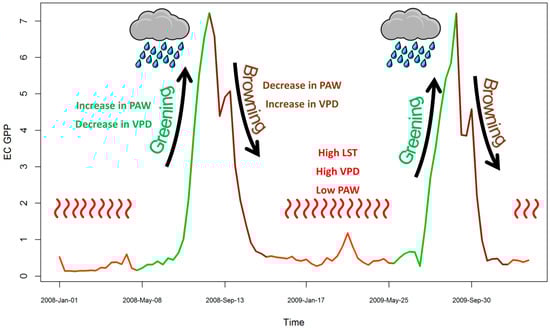 Conceptual diagram of the greening and browning processes present in the Sahel. The two peaks represent the uptake of CO2 and the increase in gross primary productivity (GPP). The greening phase begins with the start of the rainy season and the increase in plant-available water (PAW, Section 3.3.1). During the greening phase vapor pressure deficit (VPD, Section 3.3.2) decreases and so does land surface temperature (LST). The beginning of the browning phase starts with a reduction in PAW and increase in VPD and LST.