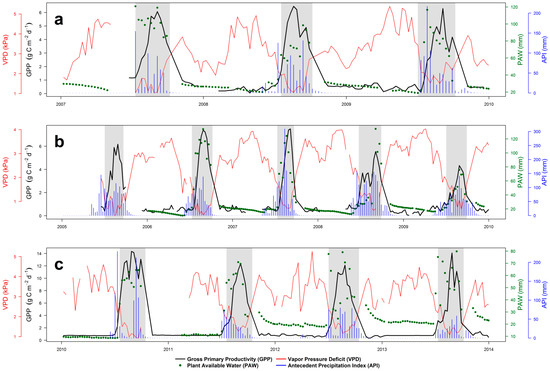 4.2. Relationship between EC GPP, PAW, VPD, and API