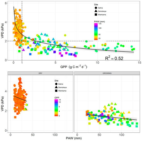 Top: Comparison of VPD and EC GPP, with coloring that indicates corresponding values of PAW for each site. Values to the left of the vertical dotted line (GPP < 1 g C m−2 d−1) and above the horizontal dotted line (VPD > 2 kPa) represent the dry season. Bottom: Relationship between the VPD and PAW per corresponding EC GPP values during the dry and growing seasons. The solid black line is the regression line with a 95% confidence interval in light gray shading.