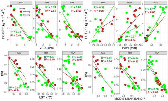 Scatterplots of the relationships between the field variables EC GPP, PAW and VPD (top row) and moderate-resolution imaging spectroradiometer (MODIS)-derived variables (bottom row) during the greening (green color) and browning (brown color) phases on a per-site basis. (DAH = Dahra, DEM = Demokeya, WAF = Wankama Fallow).