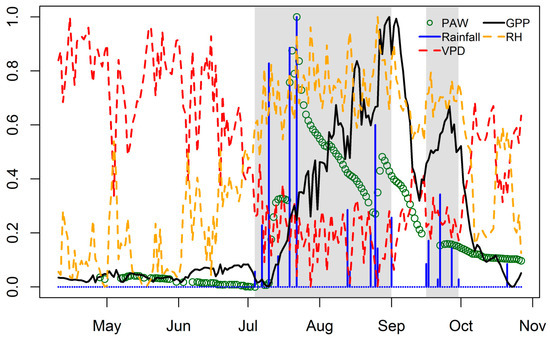 A narrowed-down example of a typical Sahelian growing season exemplified here by the 2009 growing season in Demokeya. Relative humidity (RH) begins to increase and vapor pressure deficit (VPD) begins to decrease a full month before the onset of the rainy season. Once the rains fall, plant-available water (PAW) is replenished and GPP begins to increase commencing the greening phase. Although PAW has been gradually decreasing during the growing season, the decrease in rainfall prompts a decrease in RH and an increase in VPD, which sharply reduced GPP due to stomatal closure. All variables have been normalized to between zero and one for visual purposes.