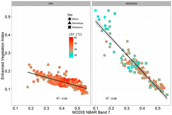 Comparison of EVI and MODIS NBAR Band 7, with coloring that indicates corresponding values of LST for each site during the growing (July–October) and dry season (November–June). The solid black line is the regression line with 95% confidence interval in light gray shading.