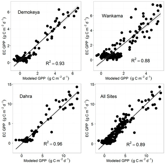 Considering both the importance of drylands in the global C cycle [85] and the dependence of human livelihoods on the products of photosynthesis [8], it is essential to account for water stress controls in order to better model primary productivity in this region. This is particularly important considering the fact that there is a chronic lack of field data on C fluxes in the Sahel. We found that the combination of MODIS NBAR Band 7 as a proxy for soil moisture variability, LST as a proxy for VPD, and EVI as a proxy of photosynthetic activity in an MLR model was able to explain 89% of the variability of EC GPP across the three Sahelian sites (Figure 8 and Figure 9). Since EVI, LST, and MODIS NBAR Band 7 are based on Earth observation data, the MLR model presented here is potentially scalable with repeatable estimates of GPP at relatively high spatial and temporal resolutions. Moreover, the availability of standardized EC flux measurements, such as the recently released FLUXNET2015 database, can potentially eliminate variability in systematic and processing-induced uncertainties between sites. This can further improve model estimates when relating EC GPP with Earth observation data. Studies of the C cycle often focus on the growing season as it is the principal period where C assimilation takes place, however, the inclusion of dry season dynamics can potentially improve the explanatory capacity of GPP models by accounting for land memory effects. Further evaluation of this approach using more dryland sites from the FLUXNET2015 database as well as other types of in-situ validation data is required to test its efficiency in modeling GPP in water-limited areas.