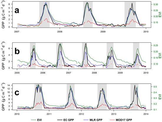 Cross-site comparison of 8-day EC GPP, EVI, the MLR GPP model, and MOD17 GPP for (a) Demokeya, (b) Wankama Fallow and (c) Dahra. The shading indicates the growing season (July–October). The large underestimation displayed by MOD17 GPP is due to the low value assigned to the maximum light use efficiency in the MOD17 algorithm [30].