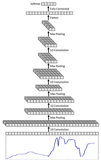 A graphical illustration of the 1D CNN we used in this work is shown in Figure 1 where a hyperspectral vector is fed to the input layer and then propagated through several successive convolutional and pooling layers for feature extraction. Each convolutional layer has multiple 1D convolutional filters (kernels). The size of the kernel is a hyperparameter and data dependent. The pooling layers are used for subsampling to reduce the dimensionality of the network, which can help reduce computation and control overfitting.