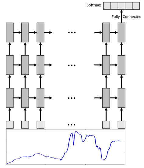 A graphical illustration of the RNN framework (regular RNN or LSTM RNN) we used in this work is shown in Figure 4 where the input hyperspectral data is viewed as a sequence of 1D vectors, which is propagated through several recurrent layers to extract deep features. The hidden states of the last recurrent layer are a sequence of high-level features. As indicated in Figure 4, we only take the last hidden state of the last recurrent layer as the input to the classification layer, since the last hidden state should already contain all of the useful contextual information in previous time steps. Like in CNN, the softmax activation function is applied at the output layer, and the loss function is formulated as the cross-entropy. Training is done by mini-batch gradient descent. However, gradients of the loss function are calculated by the back-propagation through time (BPTT) algorithm [38].