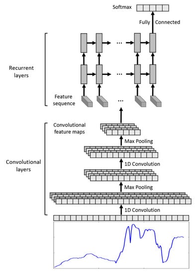 Finally, as in RNN, the last hidden state of the last recurrent layer will be fully connected to the classification layer where a softmax activation function is applied. For training, as in CNN and RNN, the loss function is chosen as cross-entropy, and mini-batch gradient descent is used to find the best parameters of the network. The gradients in the convolutional layers are calculated by the back-propagation algorithm, and gradients in the recurrent layers are calculated by the back-propagation through time (BPTT) algorithm [38].