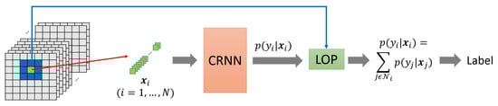 The neural networks described in Section 2.1, Section 2.2 and Section 2.3 all extract deep spectral features for each hyperspectral pixel independently. In order to further improve the classification performance, we integrate the spatial constraint by linear opinion pools (LOP) [39,40] based on the fact that, in pixel-based image classification, spatially neighboring pixels tend to have similar categories. The spatial constraint encourages piecewise smooth segmentation of images by smoothing out noisy predictions due to noisy data or outliers.