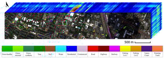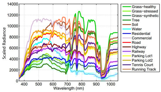 The first dataset used in this work, the University of Houston (UH) hyperspectral image, was acquired by the NSF-funded National Center for Airborne Laser Mapping (NCALM) over the University of Houston campus and the neighboring urban area using the ITRES-CASI (Compact Airborne Spectrographic Imager) 1500 hyperspectral imager in 2012. The hyperspectral image contains 15 labeled land cover classes and consists of 144 spectral bands over the 364 nm–1046 nm wavelength range. It has a spatial dimension of with a spatial resolution of 2.5 m. Figure 7 shows the true color image of the UH dataset with the ground truth for all 15 classes, and Figure 8 shows the corresponding mean spectral signatures (radiance) for each class. The spectral signatures tell that different classes have different shapes and local structures. Thus, when we treat the hyperspectral pixels as sequences, RNNs can be used to extract discriminative contextual information from them, which is very useful for classification. This dataset is available online (http://hyperspectral.ee.uh.edu).