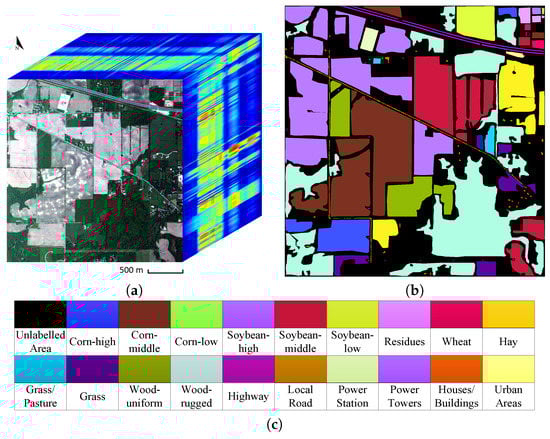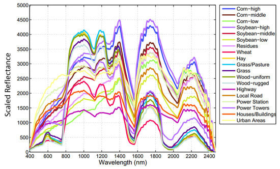 The second dataset, the Indian Pines hyperspectral image, was acquired using the ProSpecTIRinstrument in May 2010 over an agriculture area in Indiana, USA. The image has a spatial dimension of with a spatial resolution of 2 m. It consists of 180 spectral bands over the 400 nm–2500 nm wavelength range. There are 19 labeled classes contained in this dataset, and 16 of them belong to different vegetation types. Figure 9 shows the true color image with the corresponding ground truth for this dataset, and Figure 10 presents the mean spectral signatures (reflectance) of all 19 classes.