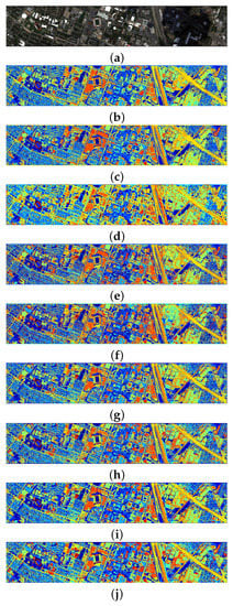 University of Houston dataset: (a) RGB image; (b–f) classification maps for different models: (b) SVM; (c) CNN; (d) 2D CNN; (e) RNN; (f) LSTM; (g) CRNN and (h) CLSTM; (i) CRNN-LOP and (j) CLSTM-LOP.