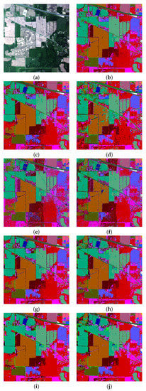 Indian Pines dataset: (a) RGB image. (b–f) Classification maps for different models: (b) SVM; (c) CNN; (d) 2D CNN; (e) RNN; (f) LSTM; (g) CRNN and (h) CLSTM; (i) CRNN-LOP and (j) CLSTM-LOP.
