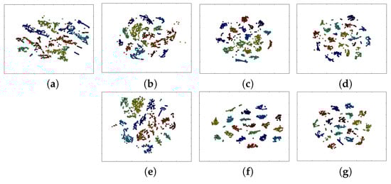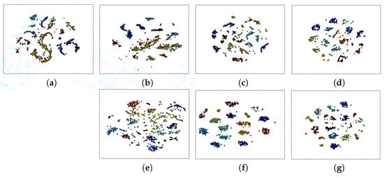 University of Houston dataset: two-dimensional embedding extracted by t-SNE for (a) input data, and features extracted by: (b) CNN; (c) RNN; (d) LSTM; (e) 2D CNN; (f) CRNN; (g) CLSTM.