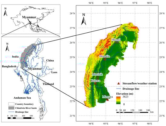Myanmar is the second largest country in Southeast Asia, sharing borders with China, Laos and Thailand in the east, and Bangladesh and India in the north. It has a 2832 km seaboard with the Indian Ocean to the west and south (Figure 1). There are four main rivers in Myanmar: Ayeyarwaddy, Chindwin, Thanlwin and Sittoung. Among them, the Chindwin River is the third largest river in Myanmar and serves as one of the principal water resources of the country and the most important tributary of Ayeyarwaddy, which is one of the major rivers in Asia. Located in northwestern Myanmar (Figure 1), the Chindwin River basin has a drainage area of 110,350 km2 and a river length of 985 km. It is dominated by a mountainous forested terrain, except for the wide flood plain at its lowest southern part. The river flows into the Central Valley Region, which is the most economically developed area of the country. Several major biodiversity and conservation areas are located in the basin, such as the Hukaung Valley and the Htamanthi wildlife sanctuaries, as well as the Upper Chindwin Catchment Corridor and the Lower Chindwin Forest Corridor with important populations of critically endangered animals [42]. In general, the Chindwin River basin is economically and ecologically important for the development of the country [42].