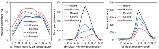 Mean monthly: (a) Air temperature; (b) precipitation; and (c) runoff at main weather and streamflow stations in the Chindwin River basin.