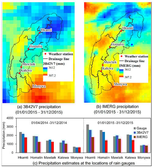 Figure 3a,b shows the spatial patterns of 3B42V7 and IMERG precipitation estimates from 1 January to 31 December 2015 in the Chindwin River basin. Both products represented a similar spatial pattern: precipitation tended to decrease from north to south. The amount of maximum annual precipitation in 2015 appeared in the source region of the basin, reaching 3345.6 mm for IMERG and 3167.6 mm for 3B42V7. The lowest amount generally occurred in the grid cells near the watershed outlet, reaching 715.2 mm for IMERG and 892.3 mm for 3B42V7. Figure 3c illustrates that the observed precipitation is in a remarkable decreasing trend from the upper to the lower reach for both periods (1 April–31 December 2014 and 1 January–31 December 2015). Both IMERG and 3B42V7 manifested a similar trend but generally underestimated the precipitation in most grid boxes where the rain gauges are located, particularly at the upstream gauges. For instance, IMERG and 3B42V7 underestimated the precipitation at the Hkamti station by 44.7% and 19.4% from 1 January to 31 December 2015. Given that IMERG estimates precipitation on a much finer resolution than 3B42V7, the former can provide more detailed spatial features of precipitation than the latter (Figure 3a,b). Overall, 3B42V7 provided considerably higher precipitation estimates than IMERG. From 1 January to 31 December 2015, 3B42V7 estimated the amount of basin-averaged precipitation to be 2014.0 mm, whereas IMERG provided an estimation of 1720.1 mm, which is 14.6% less than that of the 3B42V7 product.