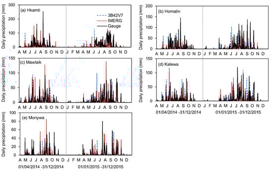 The observed historical precipitation records at the five weather stations (Figure 1) in the Chindwin River basin were analyzed to evaluate the accuracy of IMERG and 3B42V7 products. The IMERG and 3B42V7 precipitation estimates at the grid boxes where the weather stations are located were compared with the corresponding gauge-based precipitation from 1 April 2014 to 31 December 2015 at multiple temporal scales.