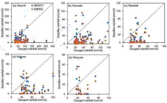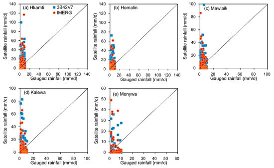Scatter plots of heavy precipitation events from 3B42V7 and IMERG precipitation products against gauged precipitation data at the five weather stations in the Chindwin River basin (1 April 2014–31 December 2015).