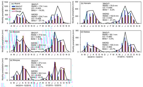 The daily precipitation estimates from IMERG and 3B42V7 at the five gauges were aggregated to monthly time series, and they were compared with the observed monthly precipitation. As shown in Figure 7, both IMERG and 3B42V7 products generally followed the variation patterns of monthly precipitation that were similar to those recorded by the rain gauges. Although the aggregation of the satellite precipitation estimates from a daily scale to a monthly scale cannot change the magnitudes of their systematic errors (BIAS), the linear correlations between the satellite precipitation and the observations were significantly improved (Figure 7). The CC values were increased in the range of 0.882–0.954 for 3B42V7 and 0.903–0.939 for IMERG. The possible reason for this improvement is that although both IMERG and 3B42V7 were comparatively inaccurate to characterize daily precipitation variability, they generally captured precipitation seasonality in the Chindwin River basin, which is indicated in Figure 4. Overall, 3B42V7 performed better than IMERG in estimating monthly precipitation at the Hkamti, Homalin, and Kalewa stations, whereas IMERG had higher accuracy than 3B42V7 at the Mawlaik and Monywa stations.