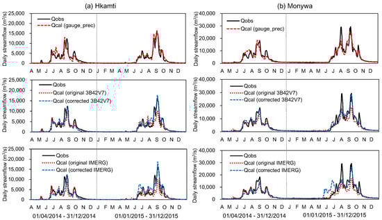 Simulated daily hydrographs using the gauge-based precipitation data, the original 3B42V7 and IMERG precipitation estimates, and their corrected data sets at: Hkamti (a); and Monywa (b) streamflow stations. Qobs represents the observed streamflow. Qcal (gauged prec), Qcal (original 3B42V7), Qcal (corrected 3B42V7), Qcal (original IMERG), and Qcal (corrected IMERG) represent the calculated streamflow using the gauge-based precipitation data, the original and corrected 3B42V7 data sets, and the original and corrected IMERG data sets, respectively.