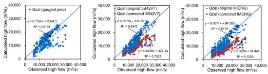 Scatter plots of the simulated high flow events using the gauge-based precipitation data, the original 3B42V7 and IMERG precipitation estimates, and their corrected data sets against the observed high flow at the five streamflow stations in the Chindwin River basin (1 April 2014–31 December 2015). The terms in the figure are the same as in Figure 8.