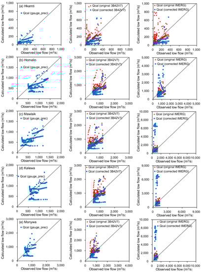 Scatter plots of the simulated low-flow events using the gauge-based precipitation data, the original 3B42V7 and IMERG precipitation estimates, and their corrected data sets at the five streamflow stations in the Chindwin River basin (1 April 2014–31 December 2015). The terms in the figure are the same as in Figure 8.
